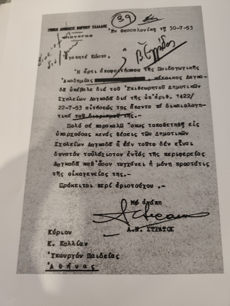 Τον Ιούλιο του 1953, μια επιστολή από τη Θεσσαλονίκη προς τον Υπουργό Παιδείας της κυβέρνησης Παπάγου, Κωνσταντίνο Καλλία, αναδεικνύει την κοινωνική διάσταση που συχνά επενδυόταν το ρουσφέτι. Ο Α.Ν. Στράτος, από τη Γενική Διοίκηση Βορείου Ελλάδος, ζητά την τοποθέτηση μιας αριστούχου αποφοίτου της Παιδαγωγικής Ακαδημίας σε σχολεία στον Λαγκαδά.