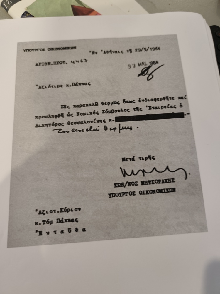 «Αξιότιμε κ. Πάππας, Σας παρακαλώ θερμώς όπως ενδιαφερθήτε και προσληφθή ως Νομικός Σύμβουλος της Εταιρείας ο Δικηγόρος Θεσσαλονίκης κ. […]». Η επιστολή φέρει τη σφραγίδα του υπουργείου και μια χειρόγραφη σημείωση που τονίζει την επιθυμία του υπουργού: «Τον συνιστώ θερμώς». Πρόκειται για ένα κλασικό δείγμα διαμεσολάβησης της πολιτικής εξουσίας στον ιδιωτικό τομέα για την αποκατάσταση ενός «ημετέρου».