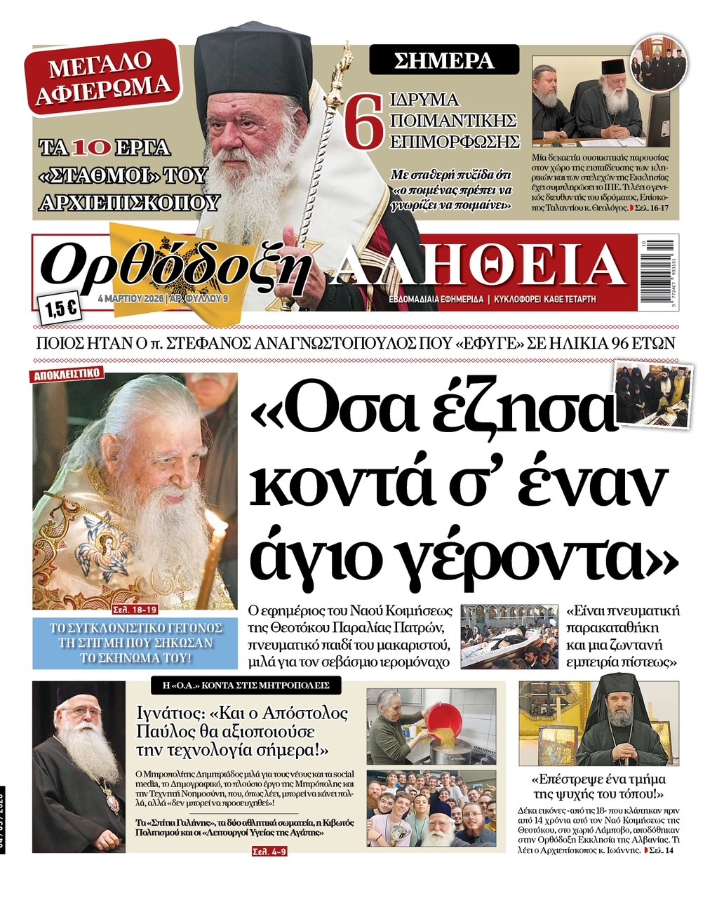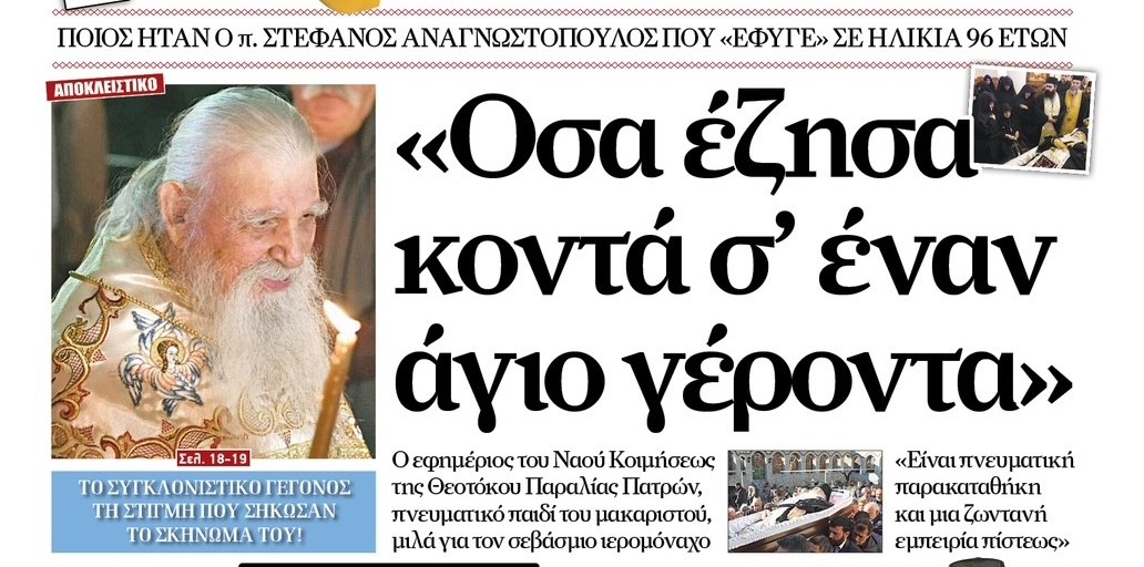 Με κεντρικό θέμα τη ζωή και την πνευματική παρακαταθήκη του μακαριστού π. Στεφάνου Αναγνωστόπουλου, που «έφυγε» σε ηλικία 96 ετών, κυκλοφορεί η νέα έκδοση της εφημερίδας «Ορθόδοξη Αλήθεια».
