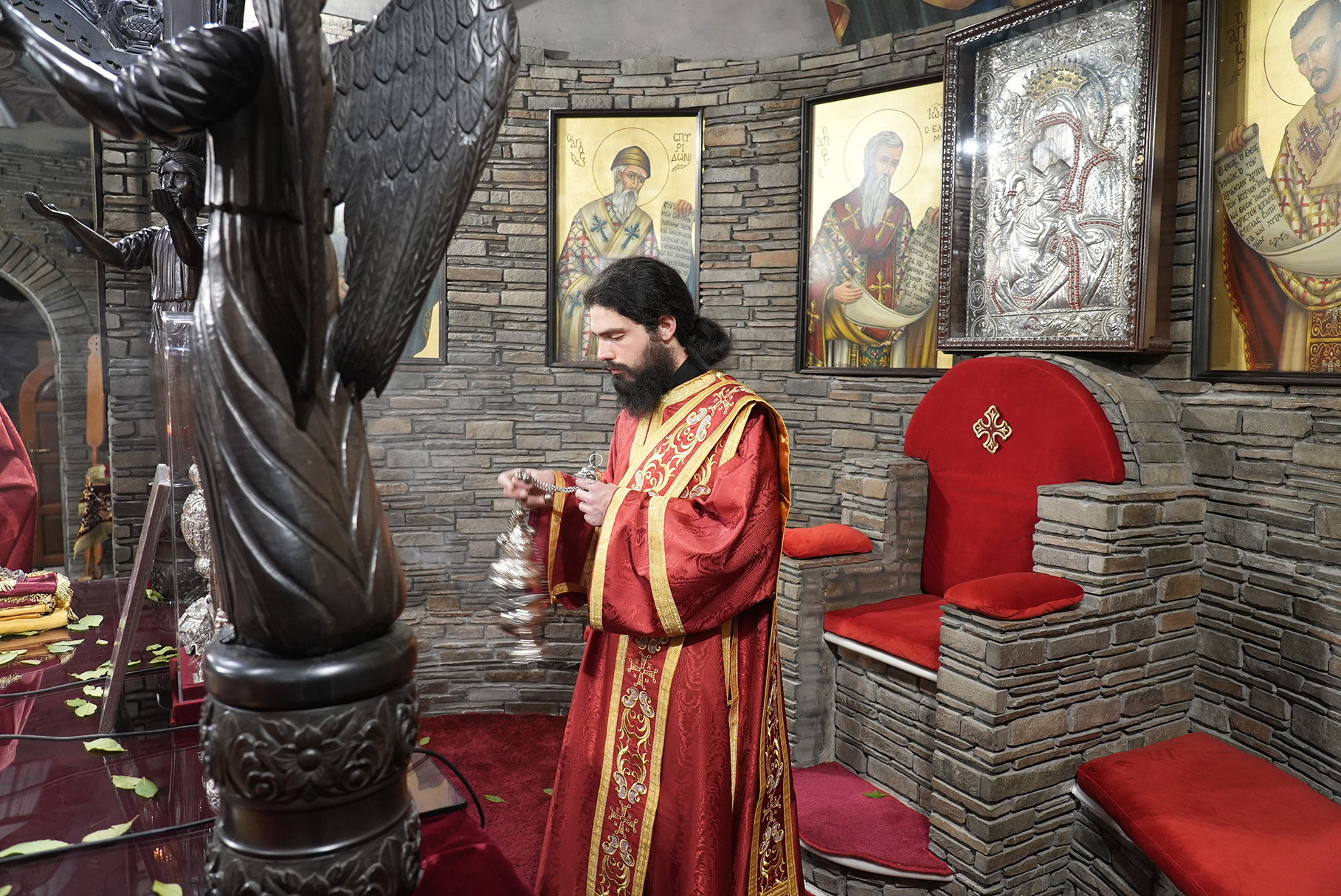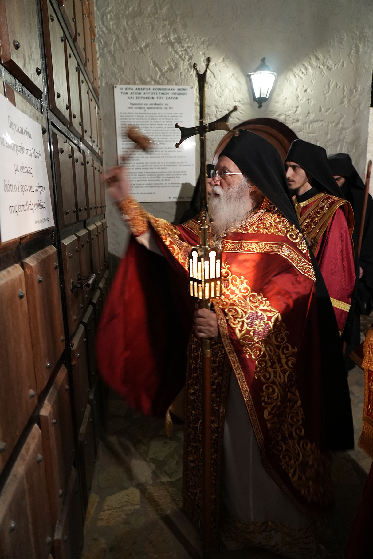 Ο Καθηγούμενος του Ιερού Ησυχαστηρίου Γέροντας Νεκτάριος Μουλατσιώτης ήταν προεξάρχων της εορτής. Αρχικά έγινε υποδοχή του Αγίου Φωτός στην είσοδο του Ησυχαστηρίου που προσκόμισε η Καθηγουμένη του γυναικείου Ιερού Ησυχαστηρίου Αγίων Νεκταρίου και Φανουρίου Δωρίδος, Γερόντισσα Μόνικα.
