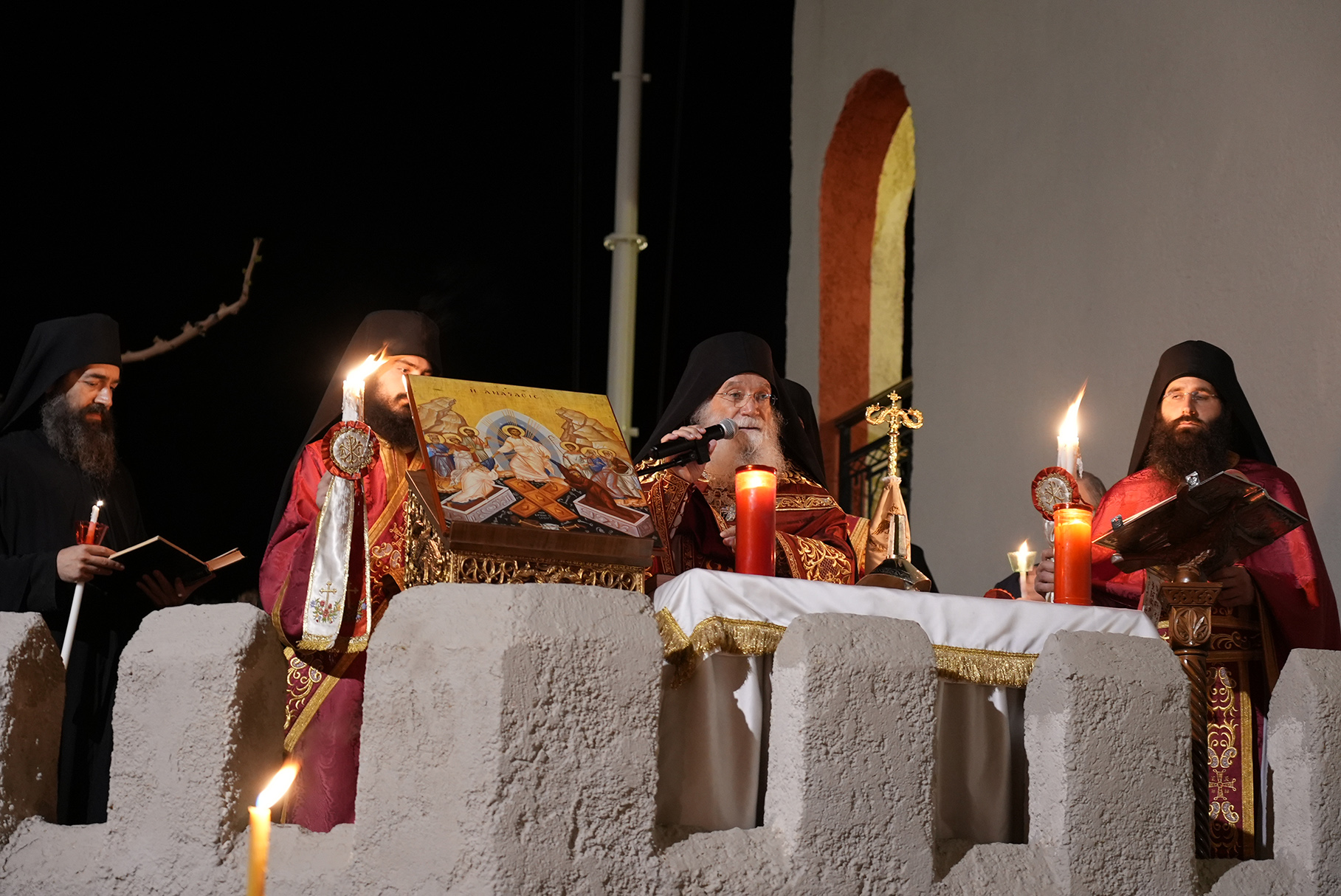 Εν συνεχεία με πομπή μεταφέρθηκε το Άγιο Φως στο ομοίωμα του Παναγίου Τάφου που υπάρχει στον αύλειο χώρο του Ησυχαστηρίου, απ’ όπου ο Γέροντας Νεκτάριος έδωσε το Άγιο Φως στους αδελφούς και στους πιστούς.