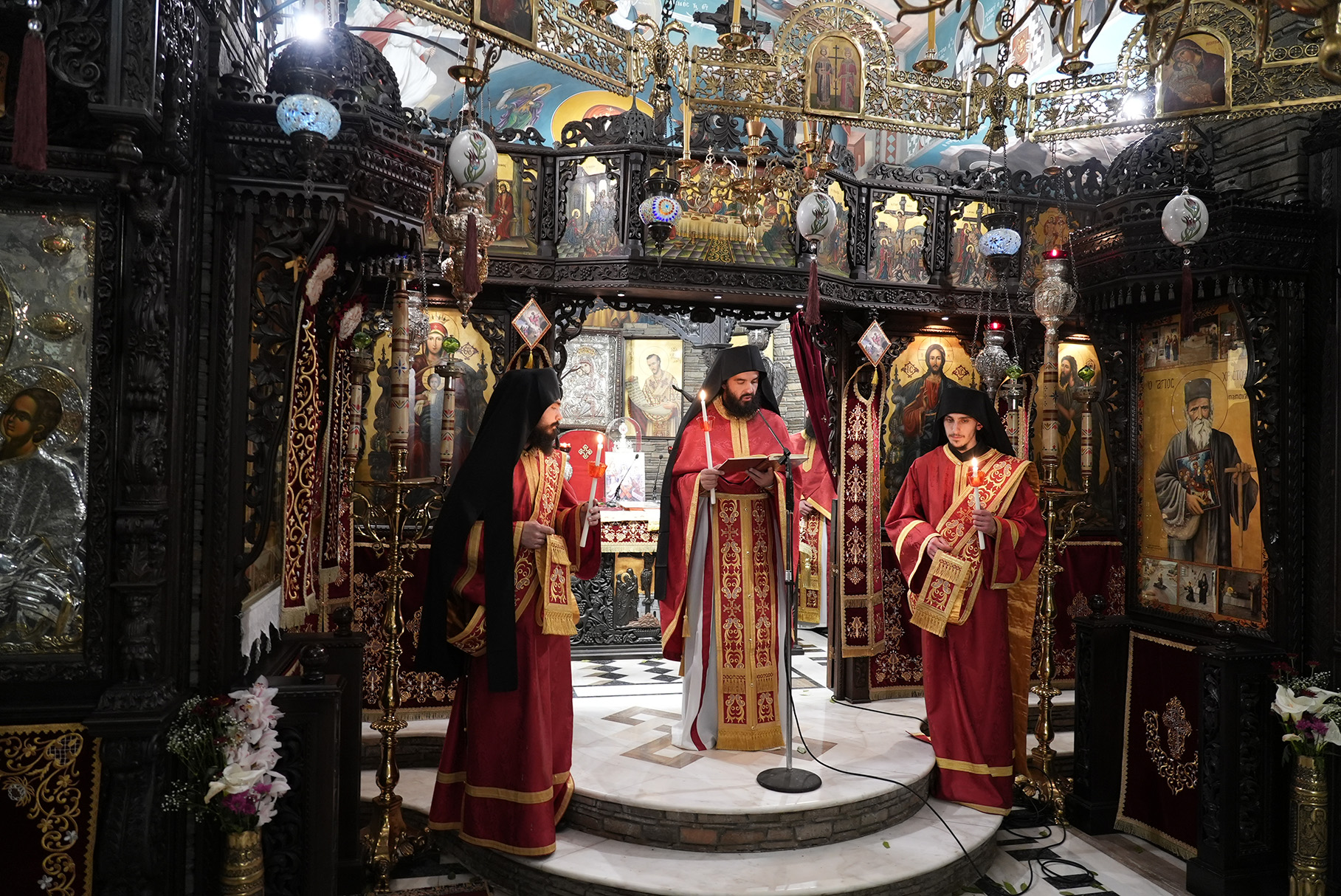 Ακολούθησε η αναστάσιμη Θεία Λειτουργία εντός του Καθολικού σύμφωνα με την αγιορείτικη παράδοση και τέλος ακολούθησε η πασχαλινή μοναστηριακή τράπεζα.