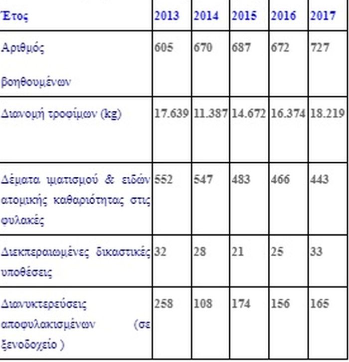Παρέχει τρόφιμα, ιματισμό, υποδήματα, είδη προσωπικής υγιεινής, πληρωμή ενοικίων, λογαριασμών ΔΕΗ- ΕΥΔΑΠ, συμβολή στην παραφαρμακευτική περίθαλψη και ψυχολογική υποστήριξη σε αποφυλακισμένους και οικογένειες κρατουμένων (250 οικογένειες), λειτουργώντας αποτρεπτικά στην δημιουργία παραβατικήςσυμπεριφοράς.