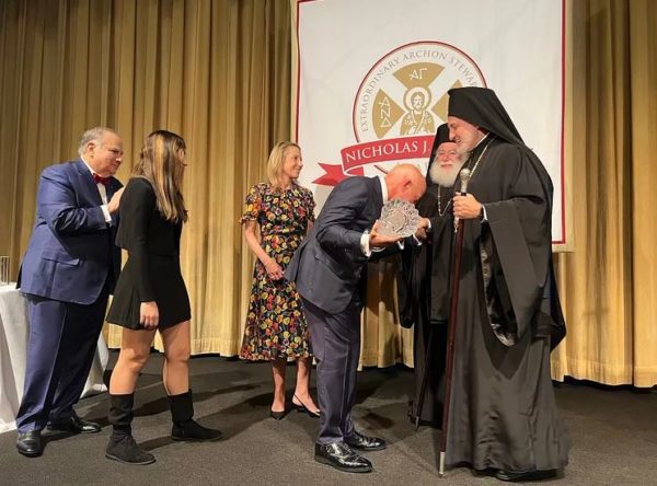 Παρέλαβε το βραβείο από τον Πατριάρχη Αλεξάνδρειας, ο οποίος, πριν την παράδοση, απευθύνθηκε στο κοινό και έπλεξε το εγκώμιο του δραστήριου ομογενούς επιχειρηματία, ενώ στο πλευρό του βρίσκονταν ο Αρχιεπίσκοπος κ. Ελπιδοφόρος και ο επικεφαλής του Τάγματος “Άγιος Ανδρέας”, Δρ. Αντώνιος Λυμπεράκης.
