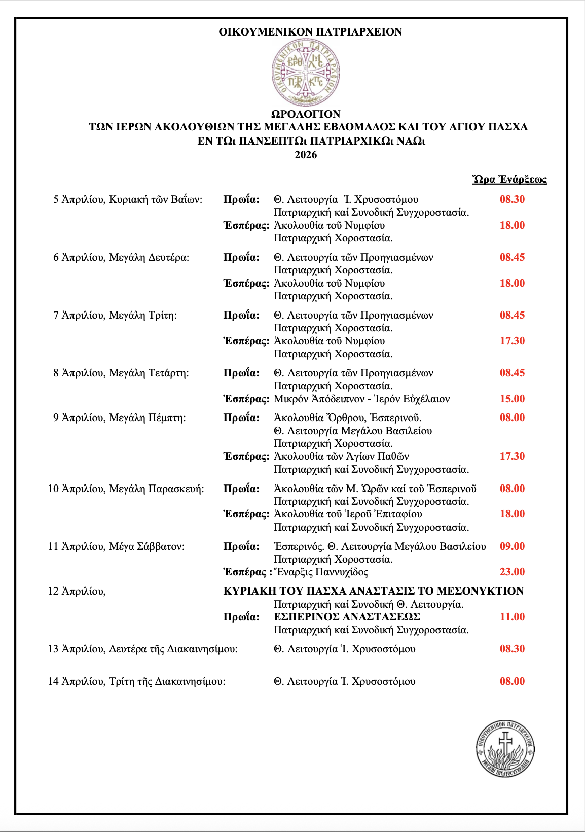 Ωρολόγιον των Ιερών Ακολουθιών της Μεγάλης Εβδομάδος και του Πάσχα στον Πατριαρχικό Ναό