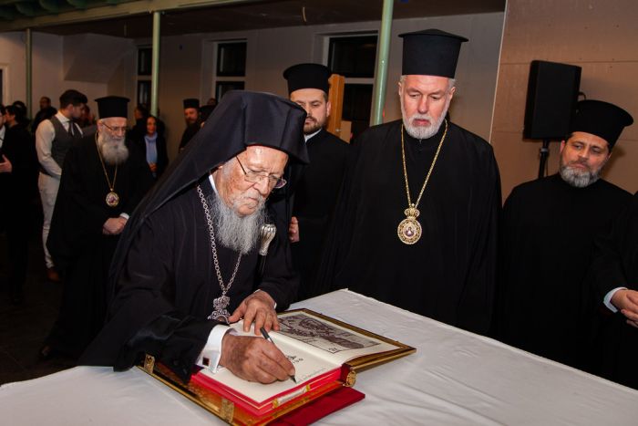 Τον Παναγιώτατο και την Συνοδεία του υποδέχτηκαν στα προπύλαια του Ναού ο ιερός κλήρος και πιστοί από το Άμστερνταμ και την γύρω περιοχή, ενώ ο Μητροπολίτης Βελγίου στην προσφώνησή του τον καλωσόρισε επίσημα, τον ευχαρίστησε για την μεγάλη ευλογία να επισκεφτεί την μικρή, αλλά δυναμική ενορία της Αγίας Αικατερίνης και για την προσωπική δωρεά που πραγματοποίησε για την αγορά του Ναού.