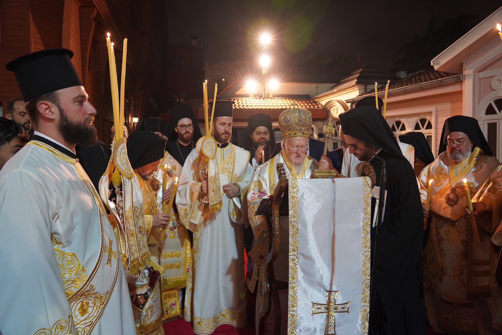 Η Α.Θ. Παναγιότης ο Οικουμενικός Πατριάρχης κ.κ. Βαρθολομαίος προέστη τα μεσάνυχτα του Μ.Σαββάτου της τελετής της Αναστάσεως στον αυλόγυρο του Πατριαρχείου, περιστοιχιζόμενος από τους Σεβ. Μητροπολίτες Βιζύης κ. Αθηναγόρα, Φιλαδελφείας κ. Μελίτωνα, Μυριοφύτου και Περιστάσεως κ. Ειρηναίο, Μύρων κ. Χρυσόστομο, Ικονίου κ. Θεόληπτο, και Σελευκείας κ. Θεόδωρο, καθώς και από τους κληρικούς της Πατριαρχικής Αυλής, και ακολούθως απηύθυνε Μήνυμα για την εορτή του Αγίου Πάσχα προς το πλήρωμα της Εκκλησίας, και ιδιαιτέρως προς τις νέες και τους νέους. Ακόμη, ευχήθηκε να επικρατήσει η ειρήνη, με βάση τη δικαιοσύνη, την καταλλαγή και την αλληλεγγύη, στη χειμαζόμενη Μέση Ανατολή και στην πολύπαθη Ουκρανία. Στο πνεύμα αυτό, εξέφρασε τη στήριξη της Μητρός Εκκλησίας της Κωνσταντινουπόλεως “στην πρωτοβουλία «Nash Vyhod – Η Έξοδός μας» για ανταλλαγή αιχμαλώτων πολέμου μεταξύ Ρωσσίας και Ουκρανίας με την ευκαιρία της μεγάλης εορτής του Πάσχα, του συνδέσμου της «άνωθεν ειρήνης» και της «ειρήνης του σύμπαντος κόσμου». Αυτό θα ήταν μια πολύ συγκεκριμένη έκφραση της δύναμης της Ανάστασης.”