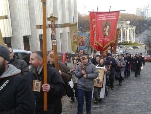 Πλήθος κόσμου συμμετείχε στην πομπή με σύμβολο τον Σταυρό την Κυριακή, ημέρα του Αγίου Αλεξάνδρου του Νέβα, όταν και πραγματοποιήθηκε μια διαμαρτυρία στην πρεσβεία του Βατικανού στο Κίεβο.