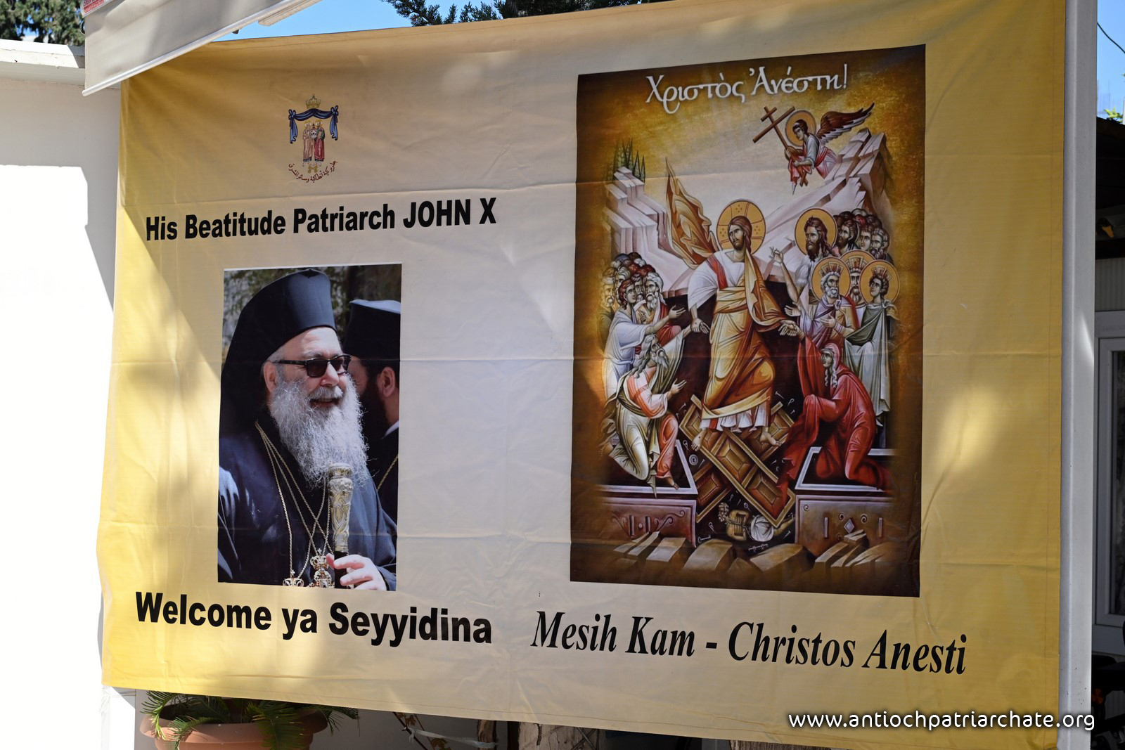 Η είσοδος του Μακαριωτάτου στον ναό έγινε μέσα σε πανηγυρικό κλίμα, με κωδωνοκρουσίες, ραίσιμο ανθέων και θερμές εκδηλώσεις αγάπης από τον λαό, ο οποίος κρατούσε πανό με το μήνυμα της Αναστάσεως και φώναζε με δύναμη το «Χριστός Ανέστη», δίνοντας το στίγμα μιας κοινότητας που παραμένει ζωντανή και ακλόνητη στην πίστη της.