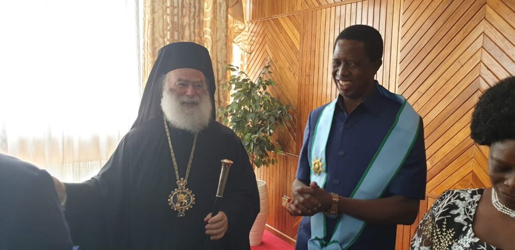 ΝΕΑ -Tο πρωί του Σαββάτου της 22ας Φεβρουαρίου 2020, πραγματοποιήθηκε στο Προεδρικό Μέγαρο της Δημοκρατίας της Ζάμπιας, επίσημη συνάντηση μεταξύ της Α.Θ.Μ. του Πατριάρχου Αλεξανδρείας και Πάσης Αφρικής κ.κ. Θεοδώρου Β΄ και του Εξοχ. Προέδρου της Δημοκρατίας της Ζάμπιας Δρος Edgar Chagwa Lungu, κατά την οποία συζητήθηκαν, μεταξύ άλλων, ζητήματα θρησκευτικής ανεκτικότητας, δικαιωμάτων των ευάλωτων ομάδων και προσώπων, περιβαλλοντικής προστασίας, και ισότητας των φύλων.