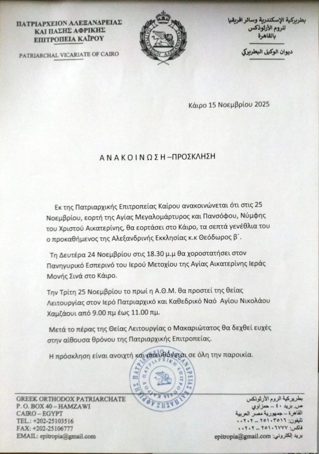ΠΑΤΡΙΑΡΧΕΙΟ ΑΛΕΞΑΝΔΡΕΙΑΣ: Στο Κάιρο θα μεταβεί ο Πάπας και Πατριάρχης Αλεξανδρείας και πάσης Αφρικής κ. Θεόδωρος Β’, προκειμένου να τιμήσει την εορτή της Αγίας Μεγαλομάρτυρος Αικατερίνης, αλλά και να εορτάσει τα ονομαστήριά του.