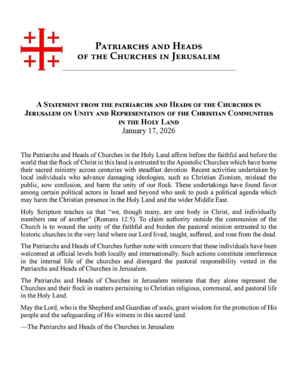 Κεντρικό σημείο της παρέμβασης αποτελεί η έντονη κριτική στον λεγόμενο «Χριστιανικό Σιωνισμό», μια ιδεολογική τάση που, σύμφωνα με τους Πατριάρχες, δρα εκτός της εκκλησιαστικής κοινωνίας και διεκδικεί ρόλο εκπροσώπησης χωρίς κανονική νομιμοποίηση. Οι Εκκλησίες καταγγέλλουν ότι τέτοιες ομάδες παραπλανούν το ποίμνιο, προκαλούν σύγχυση και υπονομεύουν την ενότητα των πιστών στην ίδια τη γη όπου γεννήθηκε ο Χριστιανισμός.