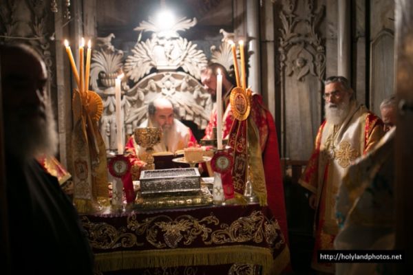Διά την εορτήν ταύτην την 12.00’ μεσονύκτιον ώραν κατήλθεν εκ του Πατριαρχείου, των κωδώνων κρουομένων, εις τον Ναόν της Αναστάσεως η Α.Θ.Μ. ο Πατήρ ημών και Πατριάρχης Ιεροσολύμων κ.κ. Θεόφιλος μετά Πατέρων Αγιοταφιτών και προεξήρξε του Όρθρου εις το Καθολικόν και της θείας Λειτουργίας εις τον Πανάγιον Τάφον, συλλειτουργούντων Αυτώ…