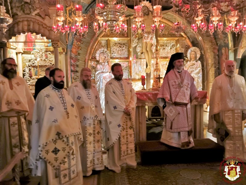 Προς τιμήν του γεγονότος τούτου ετελέσθη θεία Λειτουργία επί του Φρικτού Γολγοθά, προεξάρχοντος του Σεβασμιωτάτου Αρχιεπισκόπου Γεράσων κ. Θεοφάνους, συλλειτουργούντων των Ιερέων του Ναού της Αναστάσεως και των Αρχιμανδριτών Νεκταρίου, Μελετίου και Κλαυδίου του π. Χάδερ και του Αρχιδιακόνου π. Μάρκου και του διακόνου π. Δοσιθέου, ψάλλοντος του Ιεροδιακόνου π. Συμεών μετά των μαθητών της Πατριαρχικής Σχολής Σιών και μετέχοντος ευλαβούς εκκλησιάσματος εξ εντοπίων και προσκυνητών.