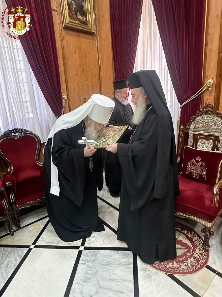 Αρχικά, ο Πατριάρχης δέχθηκε τον Μητροπολίτη Καζάν Κύριλλο του Πατριαρχείου Μόσχας, ο οποίος ηγήθηκε ομάδας ιερέων, μοναχών και προσκυνητών. Κατά την εγκάρδια υποδοχή, ο κ. Θεόφιλος αναφέρθηκε στην παλαιότερη επίσκεψή του στη Μητρόπολη του Μητροπολίτη Καζάν, καθώς και στο πολυσχιδές πνευματικό και ποιμαντικό έργο του Πατριαρχείου Ιεροσολύμων. Ιδιαίτερη μνεία έγινε στο ευαίσθητο πλαίσιο της περιοχής, υπό το φως της πρόσφατης και εύθραυστης συμφωνίας ειρήνης.