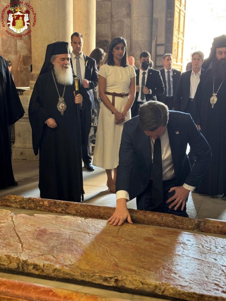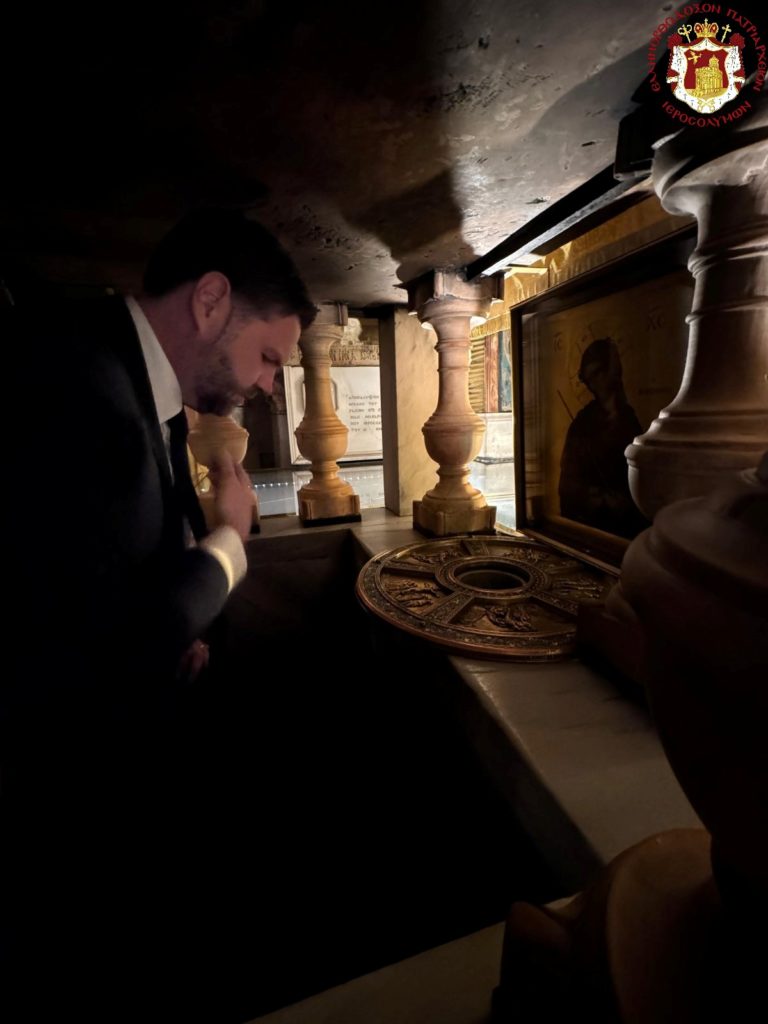 Ο Μακαριώτατος Πατριάρχης Ιεροσολύμων ξενάγησε προσωπικά τον κ. Βανς και τη σύζυγό του, Ούσα Βανς, στα ιερά προσκυνήματα του Πανίερου Ναού, όπου εξήγησε τη βαθιά πνευματική σημασία του τόπου ως σημείου Σταύρωσης και Αναστάσεως του Κυρίου. Ο Πατριάρχης εξέφρασε, επίσης, την ευγνωμοσύνη της Εκκλησίας των Ιεροσολύμων προς τις Ηνωμένες Πολιτείες για τις συνεχιζόμενες προσπάθειες ειρήνευσης, επισημαίνοντας ότι «η ειρήνη στην Αγία Γη είναι όχι μόνο πολιτική ανάγκη αλλά και θεϊκή εντολή».