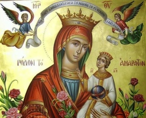 Σε ανυμνώ, Αειπάρθενε Κόρη, διότι με το να είσαι το κρίνο της αγνότητος και παρθενίας μας έδωσες το παράδειγμα της αγνής και αγίας ζωής.