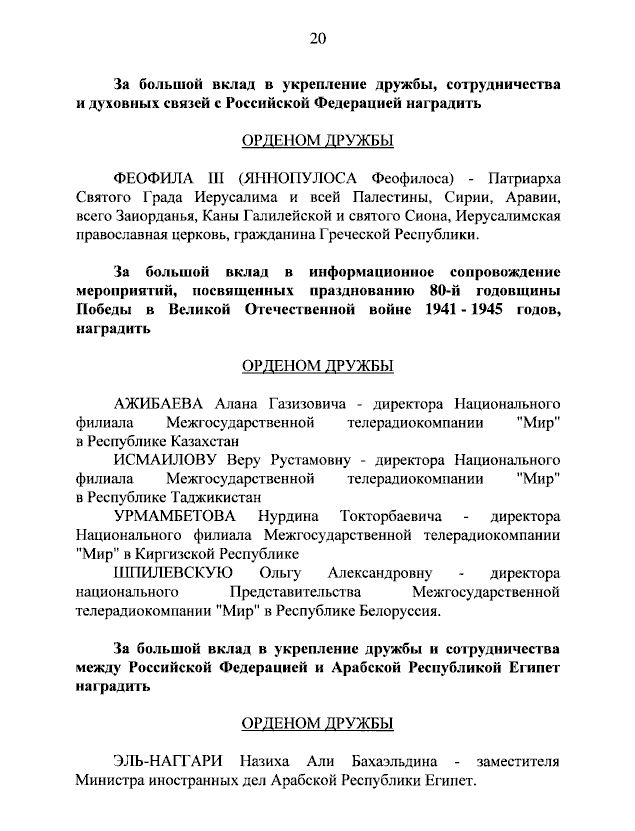ΜΟΣΧΑ: Με μια υψηλού κύρους απόφαση, ο Πρόεδρος της Ρωσικής Ομοσπονδίας Βλαντίμιρ Πούτιν τιμά τον Πατριάρχη Ιεροσολύμων κ.κ. Θεόφιλο με το παράσημο του «Τάγματος Φιλίας».