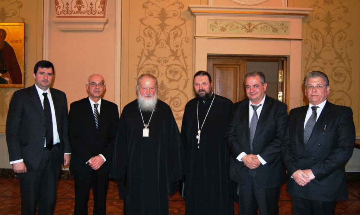 Ο Αγιώτατος Πατριάρχης Μόσχας και Πασών των Ρωσιών κκ. Κύριλλος, κατά την ώρα του «κοινωνικού» δέχθηκε εύχαρης τον Επικεφαλής και τα Μέλη κ. Βασίλειο Τζέρπο και κ. Χρήστο Πετρέα, της Αντιπροσωπείας του Συνοδικού Γραφείου Προσκυνηματικών Περιηγήσεων, της Εκκλησίας της Ελλάδος, που υπέβαλαν καθηκόντως τα σέβη τους.