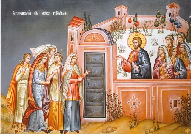 Είπεν ο Κύριος τοις εαυτού Μαθηταίς· …….ομοιώθη η βασιλεία των ουρανών δέκα Παρθένοις, αίτινες λαβούσαι τας λαμπάδας αυτών, εξήλθον εις απάντησιν του Νυμφίου, πέντε δε ήσαν εξ αυτών φρόνιμοι και αι πέντε μωραί. Αίτινες μωραί, λαβούσαι τας λαμπάδας εαυτών, ουκ έλαβον μεθ᾿ εαυτών έλαιον· αι δε φρόνιμοι έλαβον έλαιον εν τοις αγγείοις αυτών, μετά των λαμπάδων αυτών. Χρονίζοντος δε του Νυμφίου ενύσταξαν πάσαι και εκάθευδον.