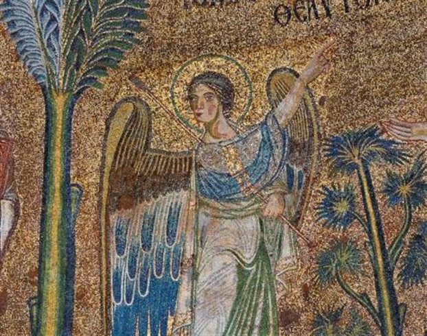 Ένας άγγελος προβάλλει μέσα από τα πολύχρωμα σύννεφα του ουρανού. Στα χέρια του δεν κρατάει σάλπιγγα αλλά μια ράβδο ξύλινη, με χρυσή επικάλυψη, πλατύτερη στη μια πλευρά, στενότερη στην άλλη. Είναι μια ιατρική ράβδος που προσφέρει σε έναν νέο με φωτοστέφανο.