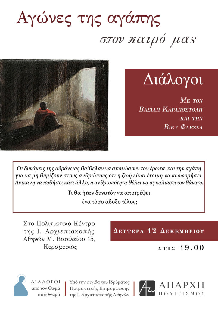 Εκδήλωση με τίτλο «Διάλογοι: Από τον Θωμά στον Θωμά· Αγώνες Αγάπης στον καιρό μας» Διοργανώνουν το Ίδρυμα Ποιμαντικής Επιμορφώσεως της Ιεράς Αρχιεπισκοπής Αθηνών σε συνεργασία με την Απαρχή την Δευτέρα 12 Δεκεμβρίου 2022 στις 19:00 στο Πολιτιστικό Κέντρο της Ιεράς Αρχιεπισκοπής Αθηνών (Μεγάλου Βασιλείου 15, Κεραμεικός).
