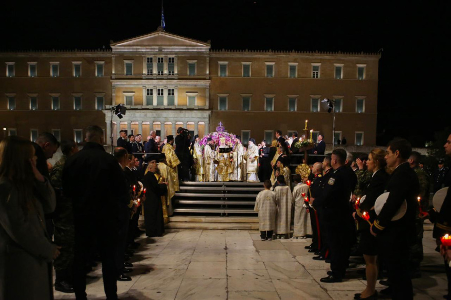 Καθ’ όλη τη διάρκεια της διαδρομής, οι πιστοί ακολουθούσαν σιωπηλά, δημιουργώντας ένα εντυπωσιακό ποτάμι φωτός από τα αναμμένα κεριά. Τα Εγκώμια ψάλλονταν σε στάσεις, με κορυφαία στιγμή τη δέηση μπροστά από το Μνημείο του Αγνώστου Στρατιώτη, όπου η πομπή σταμάτησε για να αποτίσει φόρο τιμής στους πεσόντες του έθνους, παρουσία εκπροσώπων της Βουλής των Ελλήνων.