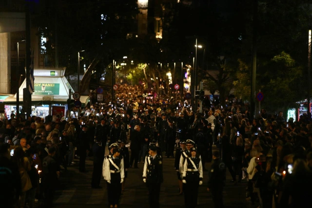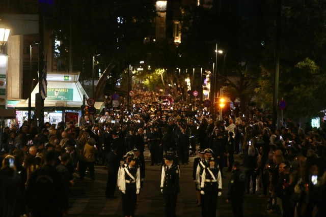 Καθ’ όλη τη διάρκεια της διαδρομής, οι πιστοί ακολουθούσαν σιωπηλά, δημιουργώντας ένα εντυπωσιακό ποτάμι φωτός από τα αναμμένα κεριά. Τα Εγκώμια ψάλλονταν σε στάσεις, με κορυφαία στιγμή τη δέηση μπροστά από το Μνημείο του Αγνώστου Στρατιώτη, όπου η πομπή σταμάτησε για να αποτίσει φόρο τιμής στους πεσόντες του έθνους, παρουσία εκπροσώπων της Βουλής των Ελλήνων.