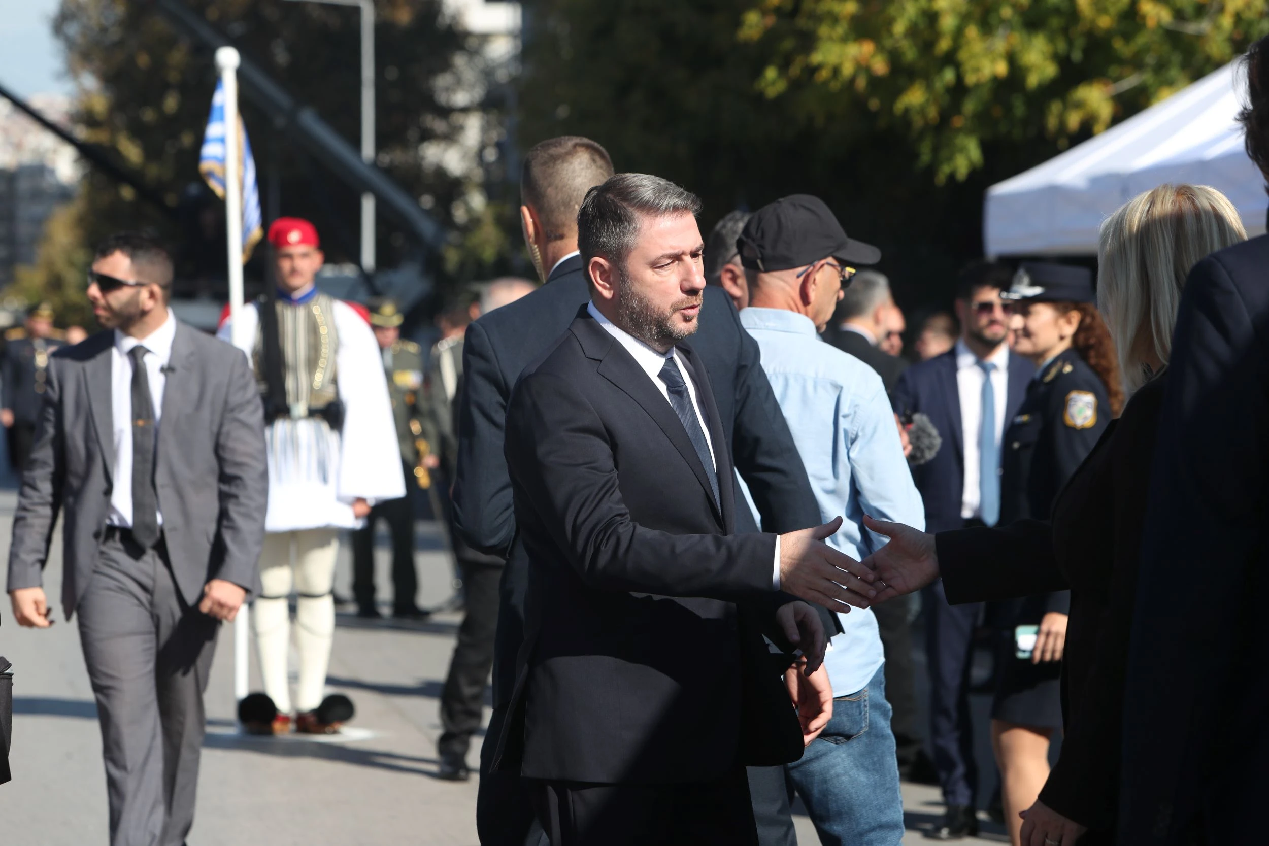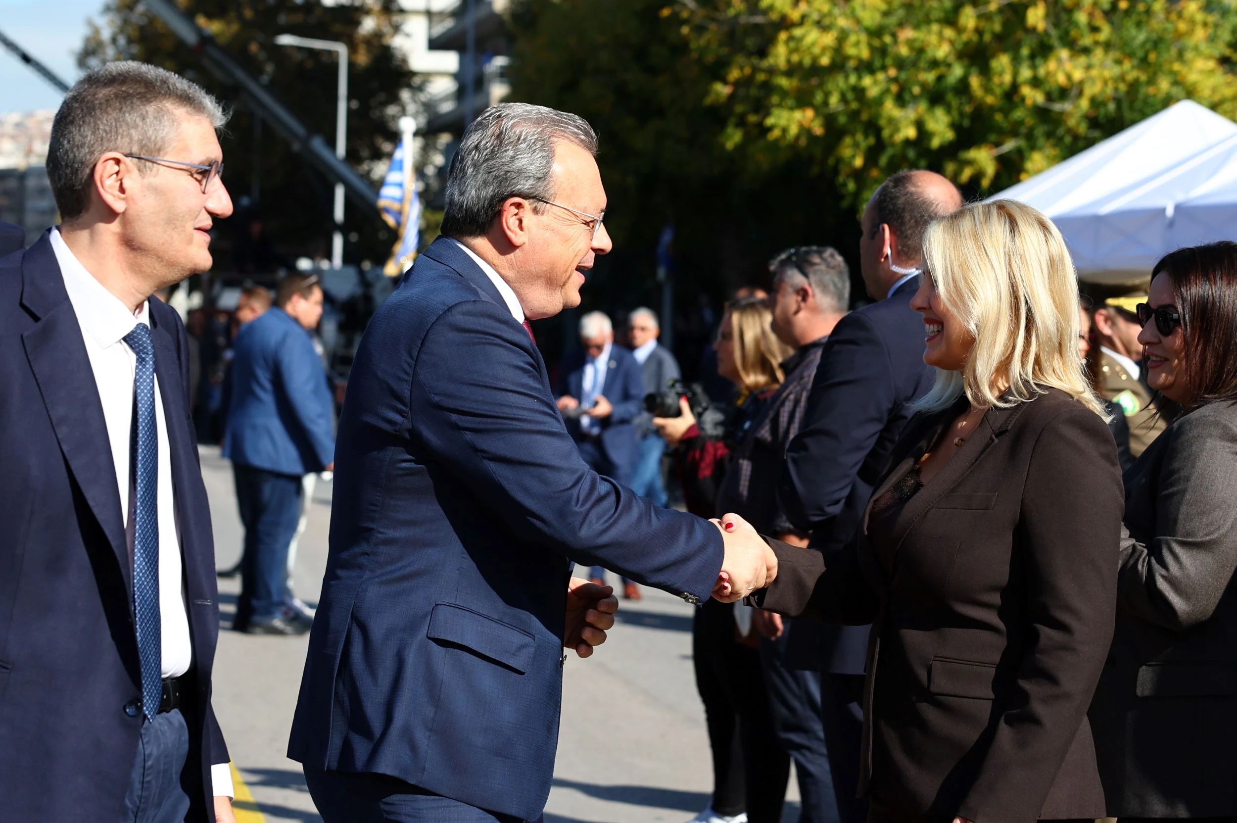 Στην εξέδρα των επισήμων βρέθηκε ο Πρωθυπουργός Κυριάκος Μητσοτάκης, πλάι στον Πρόεδρο της Δημοκρατίας Κωνσταντίνο Τασούλα, τον Υπουργό Εθνικής Άμυνας και εκπροσώπους της στρατιωτικής και πολιτικής ηγεσίας. Ο Πρωθυπουργός χειροκρότησε τα τμήματα των Ενόπλων Δυνάμεων και των σωμάτων ασφαλείας, στέλνοντας μήνυμα ενότητας και υπερηφάνειας.