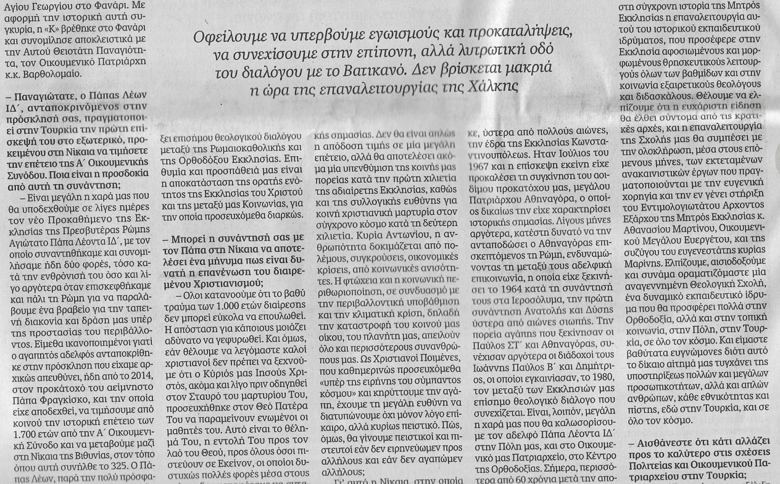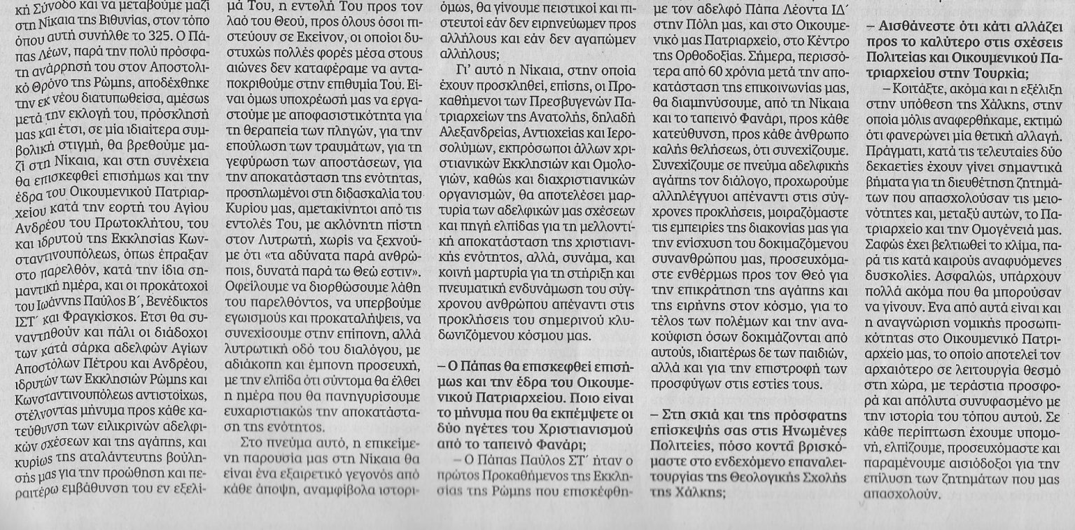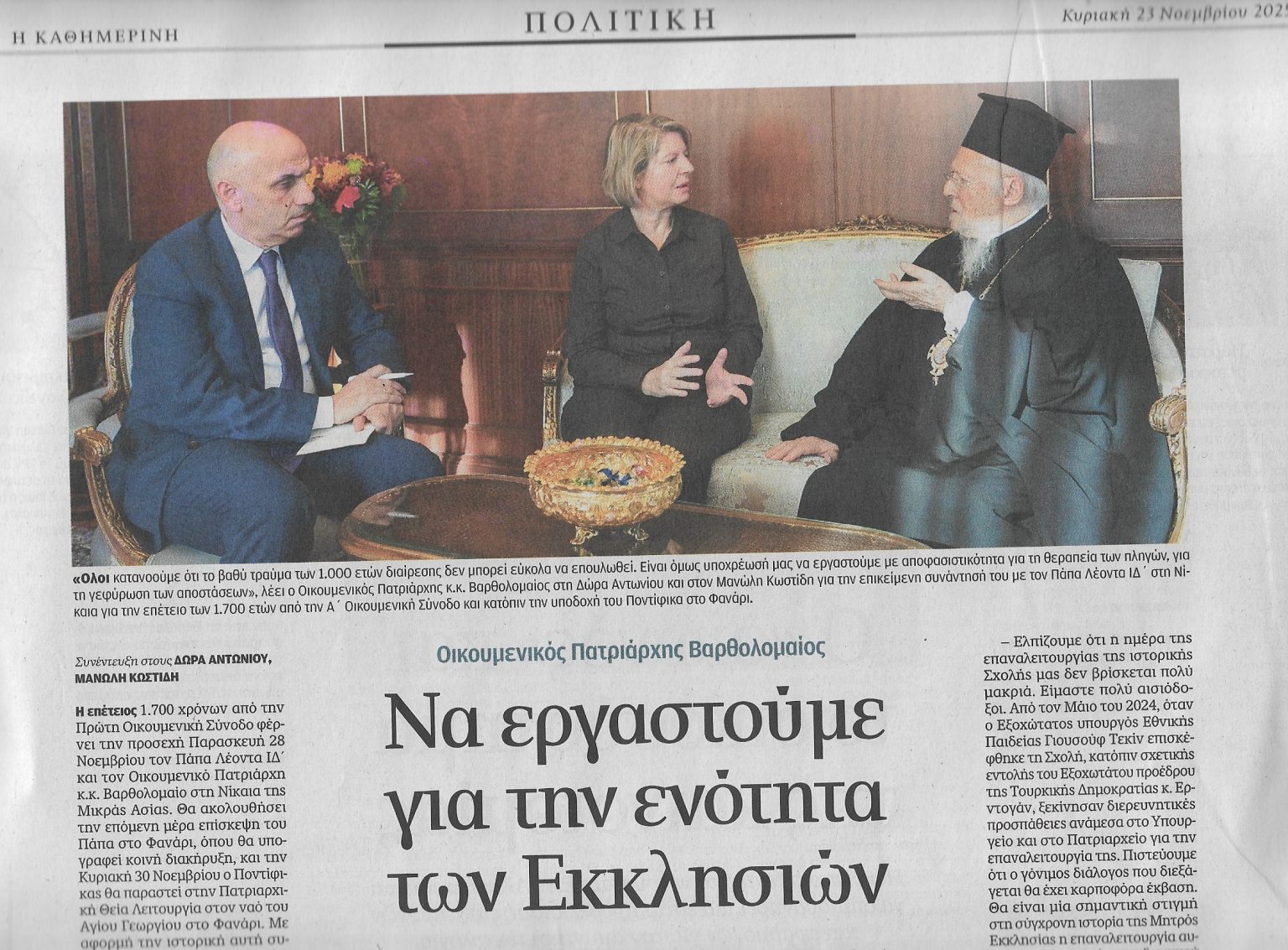 ΠΑΠΑΣ ΛΕΩΝ: Συνέντευξη-μήνυμα του Πατριάρχη στην «Καθημερινή»- Με αφορμή την επικείμενη επίσκεψη του Πάπα Λέοντος ΙΔ’ στη Νίκαια, για την επέτειο των 1.700 χρόνων από την Α΄ Οικουμενική Σύνοδο, και την εν συνεχεία μετάβασή του στο Φανάρι, ο Οικουμενικός Πατριάρχης Βαρθολομαίος παραχώρησε εκτενή συνέντευξη στην εφημερίδα Η Καθημερινή της Κυριακής 23 Νοεμβρίου 2025, στους δημοσιογράφους Δώρα Αντωνίου και Μανώλη Κωστίδη.