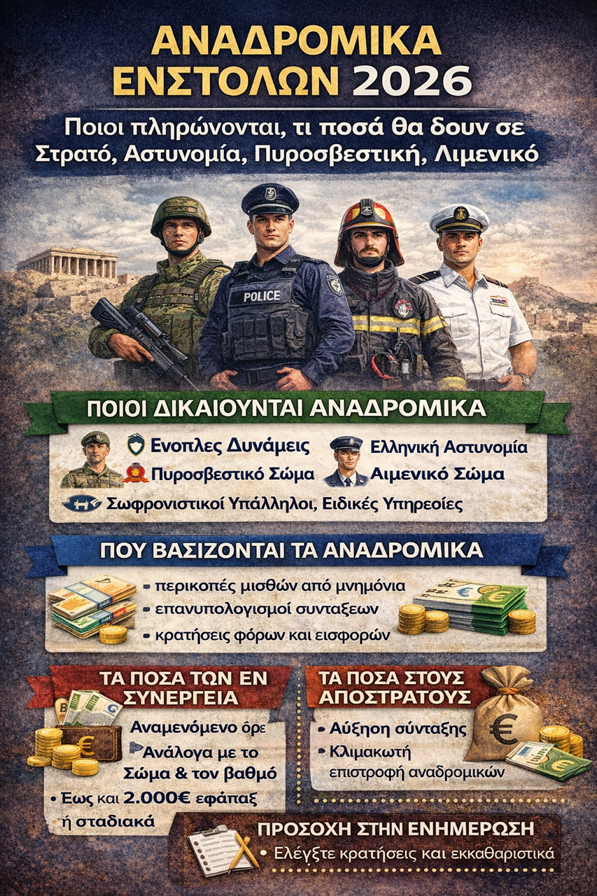 • ΑΝΑΔΡΟΜΙΚΑ ΕΝΣΤΟΛΩΝ 2026: Ποιοι πληρώνονται, τι ποσά θα δουν σε Στρατό, Αστυνομία, Πυροσβεστική, Λιμενικό – ΣΥΝΤΑΞΕΙΣ ΝΕΑ
