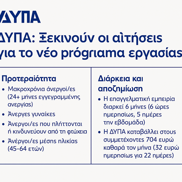 Το νέο πρόγραμμα της ΔΥΠΑ αποτελεί ένα σημαντικό εργαλείο κοινωνικής και επαγγελματικής επανένταξης για χιλιάδες ανέργους. Με 50.000 θέσεις, καθαρή αμοιβή 704 ευρώ και πλήρη ασφαλιστική κάλυψη, δίνει την ευκαιρία σε όσους δυσκολεύονται να επιστρέψουν στην αγορά να αποκτήσουν πολύτιμη εργασιακή εμπειρία, ενώ ενισχύει παράλληλα τις επιχειρήσεις με επιδοτούμενο προσωπικό και πραγματική στήριξη της απασχόλησης.