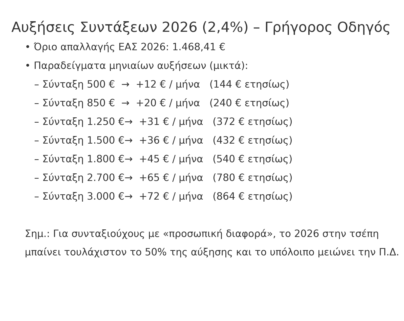 Για συνταξιούχο με 1.000€ και υπόλοιπο Π.Δ. 100€, η αύξηση 2,4% (24€) το 2026 μοιράζεται: 12€ στην τσέπη, 12€ μείωση Π.Δ. Από 1/1/2027 η ετήσια αύξηση καταβάλλεται ολόκληρη.
