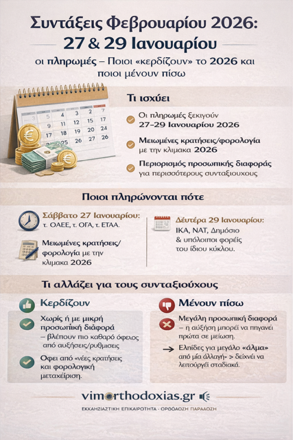 ΣΥΝΤΑΞΕΙΣ: Οι ημερομηνίες για τις συντάξεις Φεβρουαρίου 2026 «κλειδώνουν» με βάση τον προγραμματισμό του e-ΕΦΚΑ, ενώ μέσα στο ίδιο έτος έρχονται αλλαγές που επηρεάζουν άμεσα την τσέπη: από τις αυξήσεις και τη φορολογία έως την προσωπική διαφορά και την ΕΑΣ.