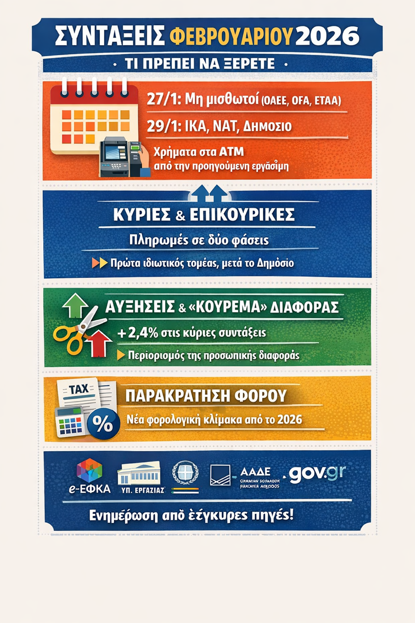 Το 2026 ξεκινά με μια διπλή πραγματικότητα: από τη μία, το κράτος θέλει να δείξει «κανονικότητα» στις πληρωμές και στη δημοσιονομική εικόνα· από την άλλη, οι συνταξιούχοι μετρούν το αποτέλεσμα στο πιο απλό τεστ, αυτό που γράφει το ΑΤΜ. Και επειδή η συζήτηση για προσωπική διαφορά, αυξήσεις και κρατήσεις θα φουντώσει ξανά, η πιο χρήσιμη άμυνα για τον αναγνώστη είναι να κοιτάζει πάντα την πρωτογενή θεσμική πηγή: e-ΕΦΚΑ, Υπ. Εργασίας, ΑΑΔΕ, gov.gr, αλλά και το Υπουργείο Εθνικής Οικονομίας & Οικονομικών όταν οι αλλαγές «κουμπώνουν» σε φορολογικό ημερολόγιο.
