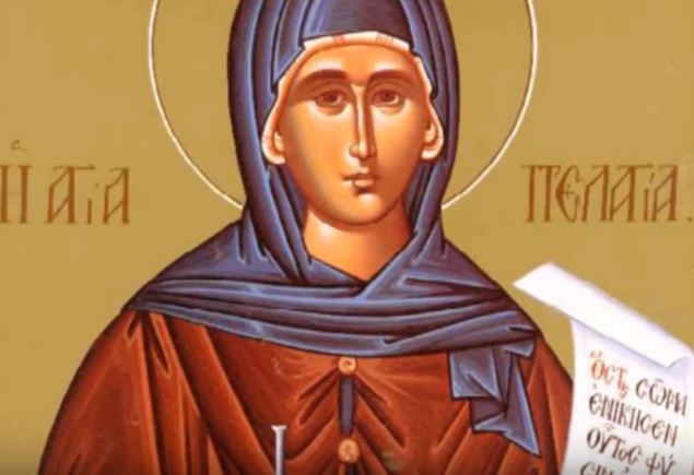 Θείας πίστεως, τὴ ἐπιγνώσει, ζόφον ἔλιπες, τῆς ἀγνωσίας, Πελαγία Χριστοῦ, καλλιπάρθενε. Οὐ τὴν ἀείζωον δρόσον πλουτήσασα, διὰ πυρὸς τὸν ἀγῶνα ἐτέλεσας. Μάρτυς ἔνδοξε, Χριστὸν τὸν Θεὸν ἱκέτευε, δωρήσασθαι ἠμὶν τὸ μέγα ἔλεος.