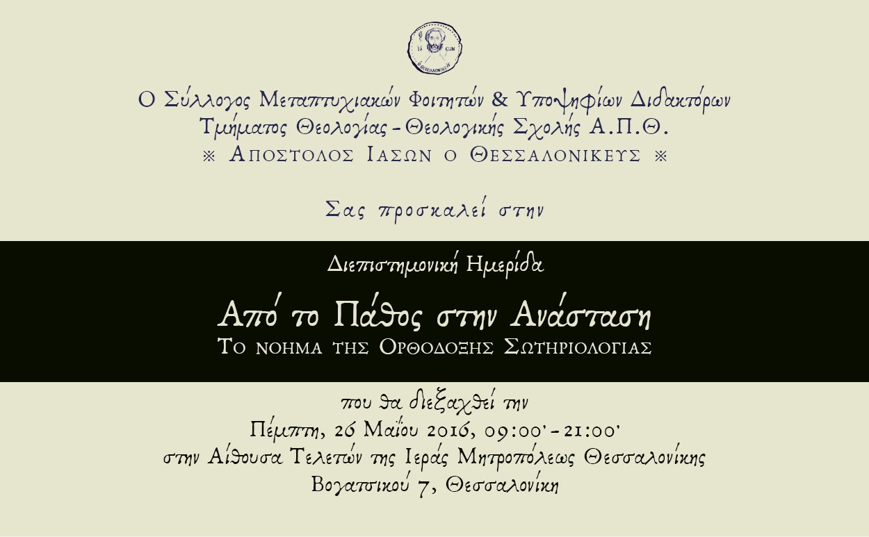Ο Σύλλογος Μεταπτυχιακών Φοιτητών & Υπ. Διδακτόρων του Τμήματος Θεολογίας της Θεολογικής Σχολής ΑΠΘ “Απόστολος Ιάσων ο Θεσσαλονικεύς” διοργανώνει Ημερίδα με θέμα “Απο το Πάθος στην Ανάσταση: το νόημα της ορθόδοξης σωτηριολογίας” που θα διεξαχθεί την 26 Μαΐου 2016, από τις 09:00 – 21:00,