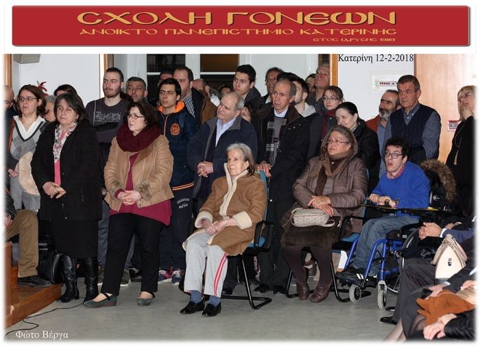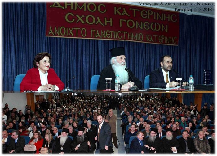 Περισσότερα απο 1000 άτομα κατέκλυσαν τις 2 αίθουσες, τις σκάλες και τους διαδρόμους του Συνεδριακού Κέντρου Κατερίνης στην χθεσινή ομιλία του Μητροπολίτη Μεσογαίας και Λαυρεωτικής κ.κ. Νικόλαου ο οποίος ήταν ο επίσημος ομιλητής και καλεσμένος της Σχολής Γονέων – Ανοικτό Πανεπιστήμιο Κατερίνης την Δευτέρα 12 Φεβρουαρίου 2018 με θέμα: «Δεν είμαι Χριστιανός… Θέλω να γίνω!».