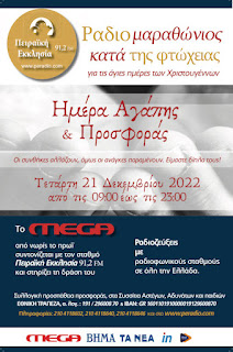 Τετάρτη 21 Δεκεμβρίου: συντονιζόμαστε όλοι στη ραδιοφωνική συχνότητα της Πειραϊκής Εκκλησίας 91,2 fm και στην τηλεοπτική συχνότητα του MEGA. Γινόμαστε όλοι κρίκοι της μεγάλης αλυσίδας αγάπης, παρηγοριάς και ελπίδας. Θυσιαζόμαστε όλοι και γευόμαστε τη χαρά της προσφοράς μας.