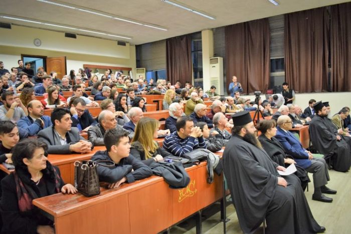 Η εκδήλωση ξεκίνησε με τους σχετικούς χαιρετισμούς από τον Πρόεδρο του Τμήματος Θεολογίας κ. Παναγιώτη Σκαλτσή, τον εκπρόσωπο του Παναγιωτάτου Μητροπολίτου Θεσσαλονίκης κ. Ανθίμου, τους εκπροσώπους των Σεβ. Μητροπολιτών Νεαπόλεως και Σταυρουπόλεως κ. Βαρνάβα, Λαγκαδά και Λητής και Ρεντίνης κ. Ιωάννου, Νέας Κρήνης και Καλαμαριάς κ. Ιουστίνου, και του εκπροσώπου των φοιτητών του Τμήματος κ. Αντώνη Μελιδονιώτη.