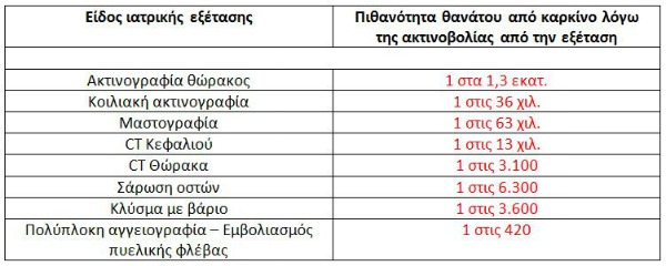 Αν ανησυχείτε για τις πιθανότητες εκδήλωσης καρκίνου, κάθε φορά που ο γιατρός σας συστήνει να κάνετε εξετάσεις που προϋποθέτουν τη χρήση ακτινοβολιών, τότε ο παρακάτω πίνακας θα σας κατατοπίσει.