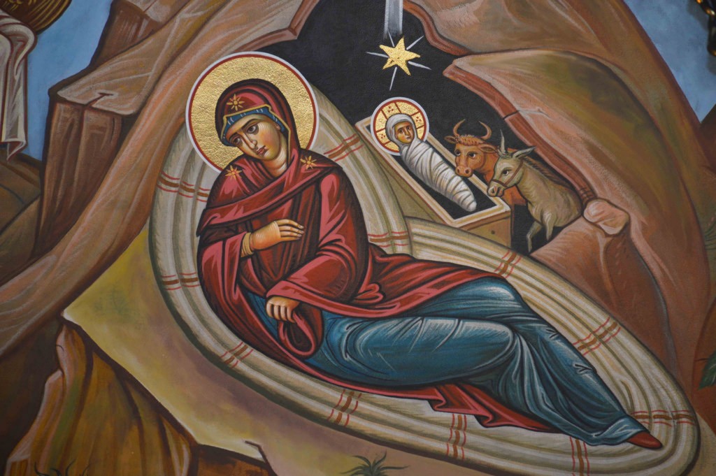 Μυστήριον ξένον, ορώ και παράδοξον• ουρανόν το σπήλαιον• θρόνον, χερουβικόν την Παρθένον• την φάτνην χωρίον, εν ω ανεκλίθη ο αχώρητος, Χριστός ο Θεός• ον ανυμνούντες μεγαλύνομεν.